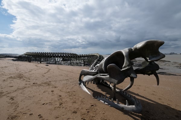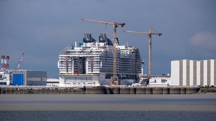 Kilometer breit. Auf der gegenüber liegenden Seite werden zwei grosse Kreuzfahrtschiffe gebaut. Eines ist fast fertig. Leider herrscht gerade Ebbe und die grosse Seeschlange liegt auf dem Trockenen.