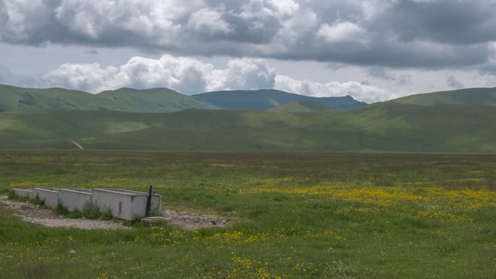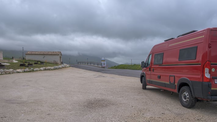 Wir fahren heute schon um halb acht Uhr los. Wir hatten bei vollkommener Ruhe gut geschlafen. Zuerst fahren wir weiter auf der SS17 bis zur Abzweigung Campo Imperiale. Die Strasse rechts führt hinauf zum Observatorium Gran Sasso. Das liegt oben auf 2100m, die Aussicht wäre toll, wenn nur die Wolken nicht wären. Der Corno Grande mit seinen 2912m steht gerade vor uns nur können wir ihn nicht sehen. Wir fahren wieder hinunter auf die SS17 weiter nach Fonte Cerreto. Dort gäbe es auch eine Seilbahn hinauf zum Observatorium, sie ist aber noch nicht in Betrieb. Dann geht weiter durch grossartige Landschaften nach Valico delle Capannelle und von dort zum Stausee Lago di Campotosto nach Amatrice. Hier halten wir nicht an, zu deprimierend ist hier die Situation. Unser nächster Fixpunkt ist die Forca di Presta, ein 1540 m hoher Passübergang. Dort hat ein sympathisches älteres Paar einen Imbisswagen. Die sind von Anfang Mai bis Ende September jeden Tag hier oben und verkaufen Sandwiches, Kaffee, Käse, Salami,Honig usw. Die Produkte sind alle aus der Gegend. Wir probieren Käse und kaufen zwei Sandwiches und zwei Salami. Die Sandwiches sind gross und super gut.