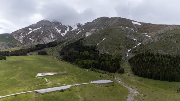 Die Strasse windet sich weiter hoch auf einen kleinen Pass. Wir haben eine phänomenale Aussicht. Unter uns liegt eine weite Hochebene auf die Strasse hinunterführt. Bald zweigt eine kleine Strasse nach rechts ab zum Rifugio Fonte Vetica. Da hat es einen grossen Wanderparkplatz auf dem Wohnmobile zwei aufeinander folgende Tage stehen bleiben dürfen. Hier auf 1600m Höhe bleiben wir bis Morgen. Wir sind Einzigen hier. Das Gebiet ist menschenleer. Wir wandern ein wenig umher, fotografieren Blumen und ich lasse die Drohne fliegen. Als wir wieder in der Zora sitzen hoppelt auch noch ein stattlicher Hase vor der Zora durch. Handy Empfang hat es hier keinen. Der Bericht kommt somit einen Tag später auf die Webseite.