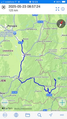 Der SP hier in dem Ort war gut zum Übernachten. Wir fahren zeitig weg. Das heutige Ziel ist Assisi. Wir fahren zuerst aber ein Stück zurück über den namenlosen Pass bis zur Abzweigung unterhalb Castelluccio. Dort biegen wir ab in Richtung Norcia. Es regnet immer wieder aber trotzdem geniessen wir auch diesen neuen und kurvigen Abschnitt. Norcia ist offenbar eine Hochburg für Salami aller Art. Wir haben aber ja bereits gestern auf der Forca di Presta zwei erstanden. So fahren wir weiter bis nach Assisi. Hier wird es wieder stressig. Das Navi, wir benutzen Sygic, will uns wieder in unmögliche kleine Strässchen führen. Der Camping Fontemaggio ist leider auch auf keinen Hinweistafeln zu finden. Einmal müssen wir wieder einmal in einer engen Strasse wenden. Das ist nicht wirklich lustig. Am Ende ist die Missachtung von 2 Schildern notwendig, die die Durchfahrt für Camper verbieten, um an unser Ziel zu kommen. Mit unserem Ducato können wir dieses Risiko eingehen, sind für doch kleiner als die normalen teilintegrierten Fahrzeuge.
