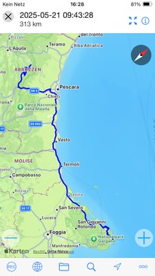 Wir fahren bald los. Zuerst über die hügelige Halbinsel von Gargano. Immer in der Nähe der Küste. Wir kommen an unzähligen Campingplätzen vorbei. Die meisten sind aber immer noch geschlossen. Die Strasse führt immer wieder sehr steil und mit vielen Kehren die Hügel hinauf und hinunter. Später wechseln wir auf die Autobahn bis nach Pescara und dann in westlicher Richtung in Richtung Rom. Bei Capestrano verlassen wir die Autobahn in Richtung Castel di Monte. Nun wird die Fahrt und die Landschaft wieder abwechslungsreicher. Bei Ofena, einem kleinen Nest an einem Berghang wird es kurz hektisch. Das Navi ist völlig von der Rolle und will uns mitten durch das Dorf schicken. Ich ignoriere die Anweisung im Wissen, dass das unmöglich stimmen kann und fahre auf der Regionalstrasse weiter. Bei der ersten Möglichkeit halten wir an. Wir löschen die Route im Navi und geben sie neue ein. Nun stimmt die Sache wieder.