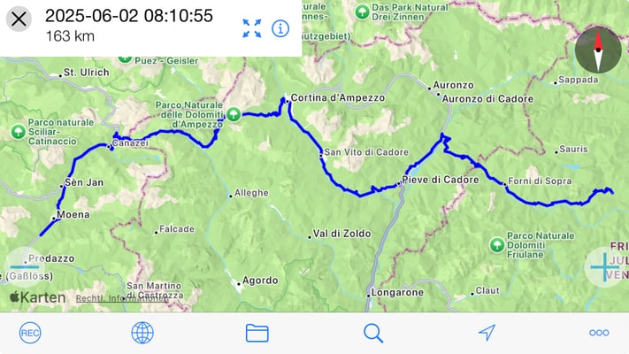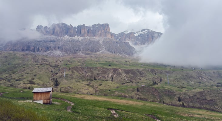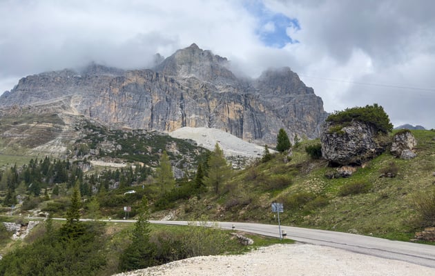 Die Fahrt bis zu unserem heutigen Übernachtungsplatz führt durch die Dolomiten, an Cortina d’Ampezzo vorbei und über die Pässe Falzarego und Pordoi. Leider hängen die Wolken auf der ganzen Strecke tief und viel von der schönen Bergwelt können wir nur erahnen.