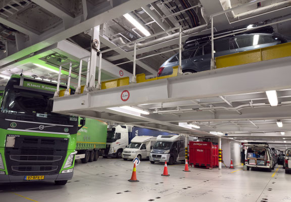 Unsere Zora wird auf der Fähre zuhinterst in einer kleine Ecke versteckt. Könnte das vielleicht an ihrer subversiven roten Farbe liegen die im weissen Camper Einheitsbrei so auffällt? Nach einem kurzen Rundgang bis ins oberste Aussichtsdeck gehen wir in den Bereich wo es das reichhaltige Frühstück gibt. Helene bedient sich bei Müesli und Früchten. Ich lange beim gebratenen Speck, den Eiern und den Bratkartoffeln zu. Zum Glück ist das Meer fast ruhig und mein Magen auch.