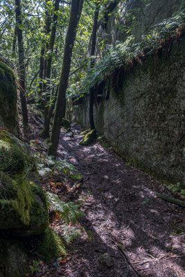 ruppig. Der gut markierte Weg geht immer wieder kurz steil bergauf und dann gleich wieder hinunter. Lange Steigungen hat es nicht. Dafür ist der Pfad von grossen Steinen und unzähligen Wurzeln