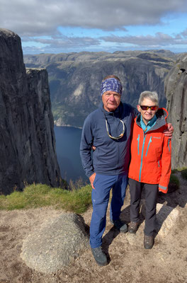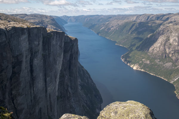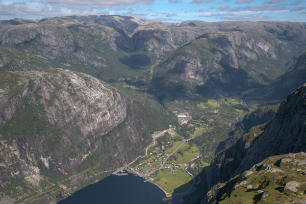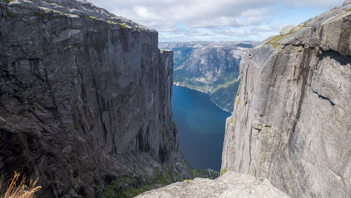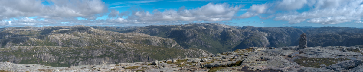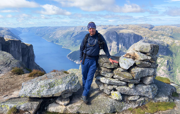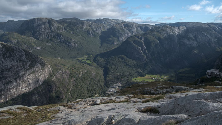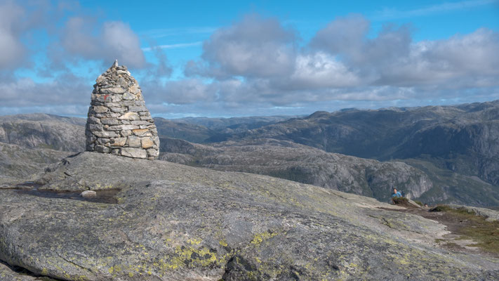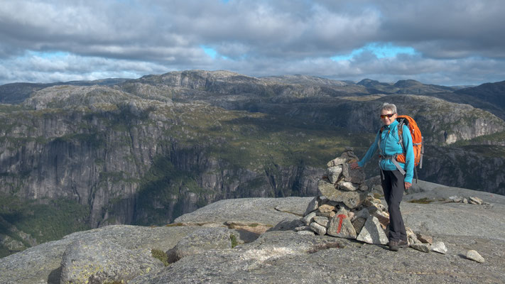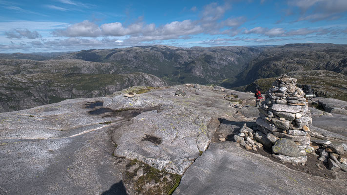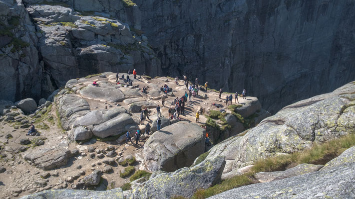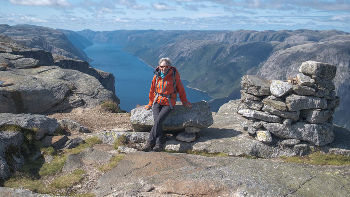Wir lassen das bleiben und fotografieren nur den Stein. Das geht seht gut, dauert es doch immer eine Weile, wenn die Personen auf dem Stein wechseln. Danach wandern wir auf dem Plateau weiter nach vorne um einen schöneren Blick auf den Lysefjord werfen zu können. Der Rückweg braucht dann auch noch etwas Saft, denn nun müssen wir alle Gegenanstiege bewältigen.