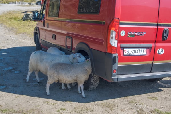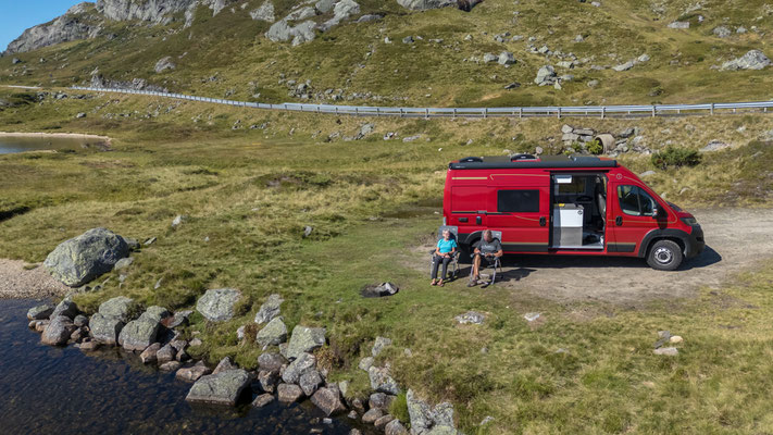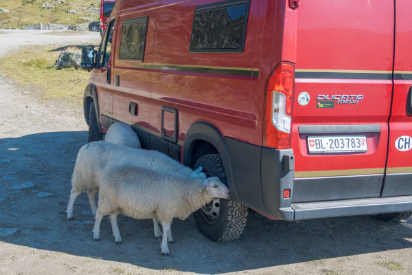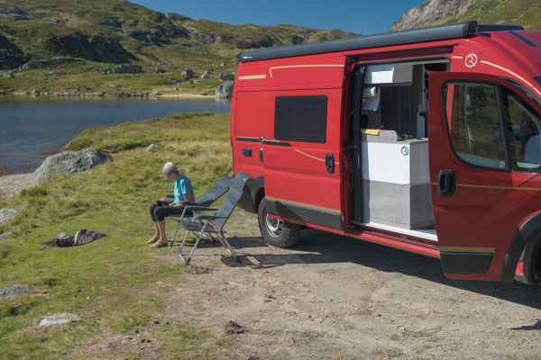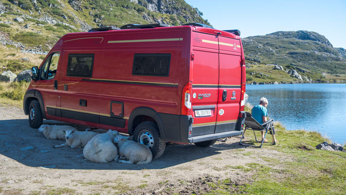 Bei See Indre Flogvatn sehen wir ein kleines freies Plätzchen. Wir haben es heute, wie gesagt, überhaupt nicht eilig und so bleiben wir hier längere Zeit stehen. Als wir relaxed in unseren Stühlen sitzen, hören wir von der anderen Seite der Zora immer mehr seltsame Geräusche. Beim Nachsehen treffen wir auf 4 Schafe die an der Radnabe, an den Reifen und sogar im Radkasten lecken. Wir haben keine Ahnung was daran gut sein soll. Nach einiger Zeit legen sie sich in den Schatten der Zora und wir hören nur noch die beim Wiederkäuen entstehenden Geräusche.