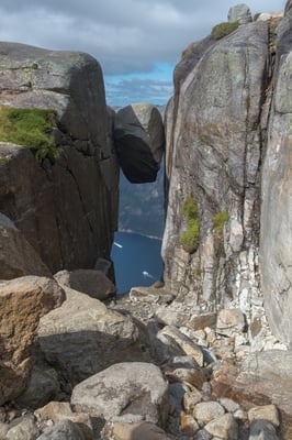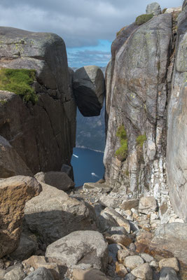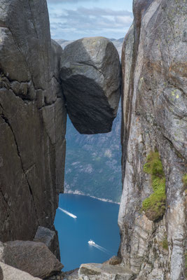 Die Landschaft gefällt uns gut. Wir haben einen weiten Blick über das Fjell. Weit unten ist der tiefblaue Lysefjord. Nach 2 ¾ Std. Sind wir auf dem Kjerag. Zum eingeklemmten Stein müssen wir noch durch eine feuchte kleine Schlucht ein wenig weiter hinunter. Dort ist schon eine grössere Gruppe Fotografen bereit, ihre Freunde auf dem Stein zu fotografieren. Diese stehen weiter hinten bei einem Felsen in der Schlange an, bis sie an der Reihe sind um die Mutprobe auf dem Stein zu bestehen. Die gelingt bei weitem nicht allen Personen souverän.