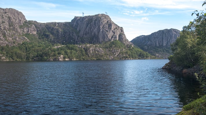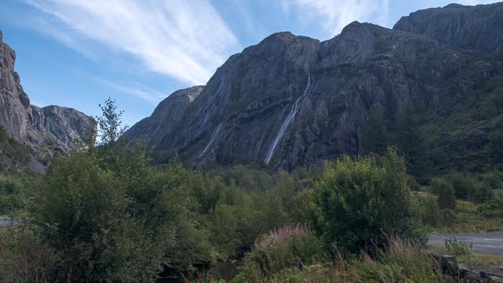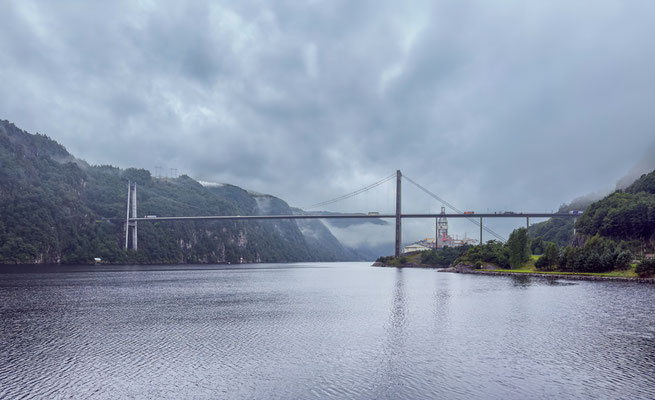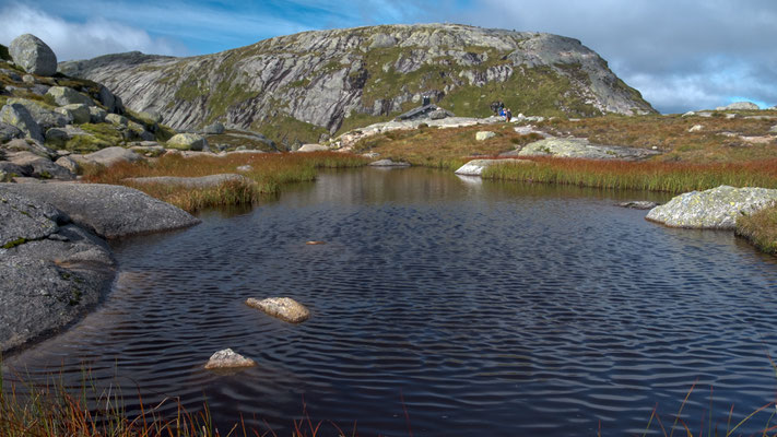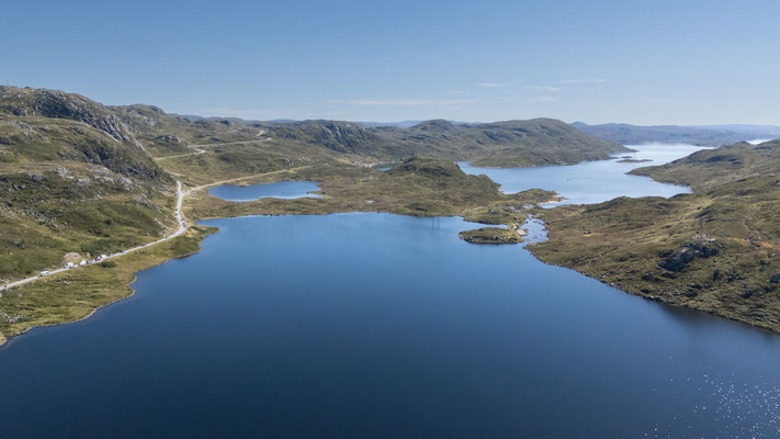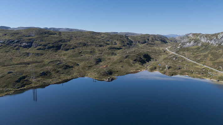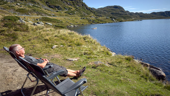 Endlich scheint beim Aufstehen wieder einmal die Sonne. Heute wollen wir auf der Strasse Fv44 weiter in Richtung Stavanger fahren. Die Strasse führt durch eine abwechslungsreiche Landschaft. Es hat kaum Verkehr, so stören wir auch niemanden bei unserer Bummelei und falls doch mal ein schnelleres Auto kommt, machen wir natürlich brav Platz. In der Region von Ana-Sira führt uns die Strasse mehrere Male steil hinunter nur um uns kurz darauf wieder zurück auf das Hochplateau zu führen.