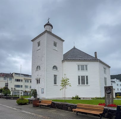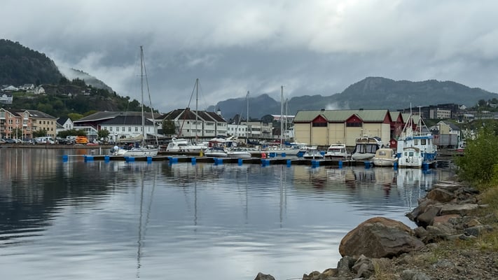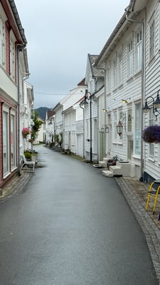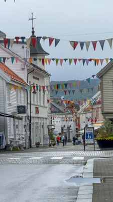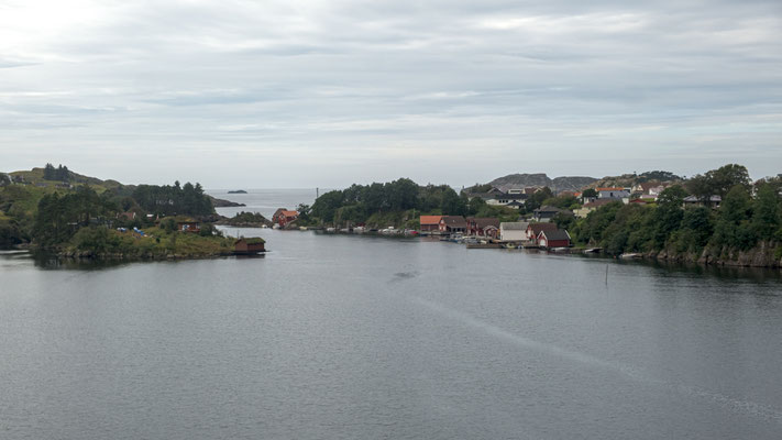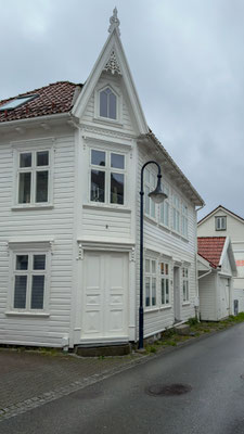 Die Fahrt über die Strasse 465 ist landschaftlich wunderbar. Leider hängen die Wolken tief. In Flekkefjord schauen wir uns die schönen alten weissen Holzhäuser im Holländerviertel an. Das Viertel entstand um 1520. Treiber war der Seehandel mit Holland. Norwegen exportierte viel Eichenholz nach Holland, das dort für den Bau von Schiffen und Häusern nachgefragt wurde. Viele holländische Kapitäne kamen mehrere Male pro Jahr nach Flekkefjord und begannen ihre Familien mitzubringen und hier zu überwintern. Ein Hauptgrund dafür war, dass die Handelskontrakte für das jeweils kommende Jahr während des Winters ausgehandelt und vergeben wurden.