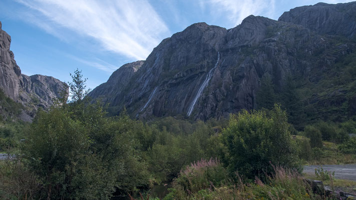 Nach den letzten beiden Tagen mit Wanderungen nehmen wir es heute gemütlich. So stehen wir erst mal erst um 9 Uhr auf. So spät ist es während dieser Reise noch nie geworden. Den CP verlassen wir etwa 2 Std. später. Wir fahren auf der Strasse, auf der wir her gekommen sind dem Suleskardveien, wieder zurück zur E9. Es ist ein wunderschöner Sonntag und so sind auch sehr viele Norweger unterwegs.