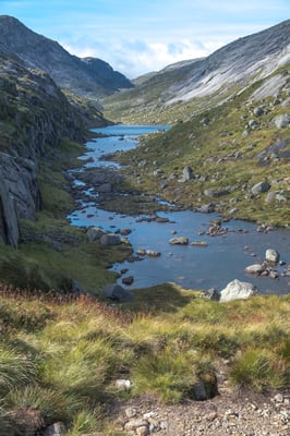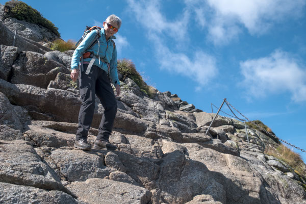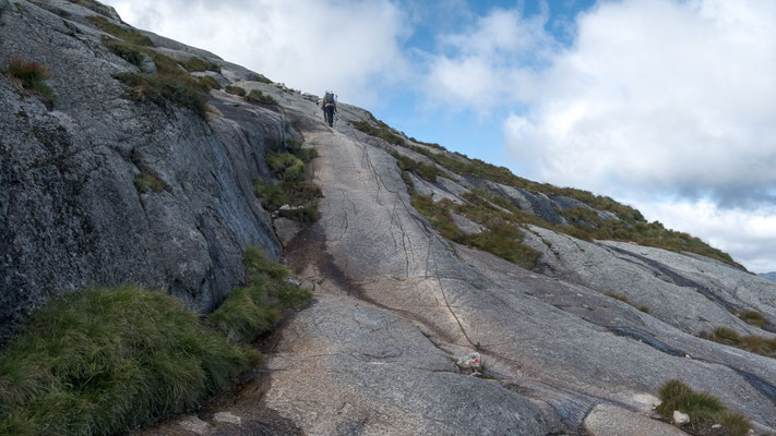 Der Weg ist weit über der Baumgrenze und verläuft meisten über Granitplatten. Die steilen Abschnitte, von denen es einige hat, sind mit Ketten gesichert an denen man sich auch hinauf hangeln kann.