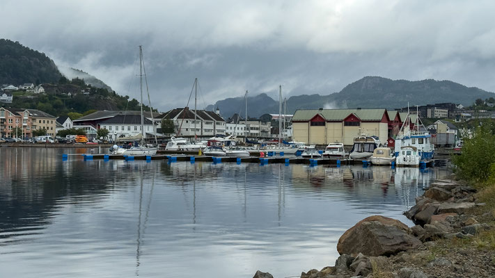 Das Wetter wird immer schlechter. Bis jetzt war es meist sehr wechselhaft, heute aber dominiert der Regen. Hier im kleinen Ort Vanse ist nicht viel los. Wir beschliessen nach Flekkefjord zu fahren. Dort hat es einen grossen SP am Hafen und der Ort ist ein wenig grösser.