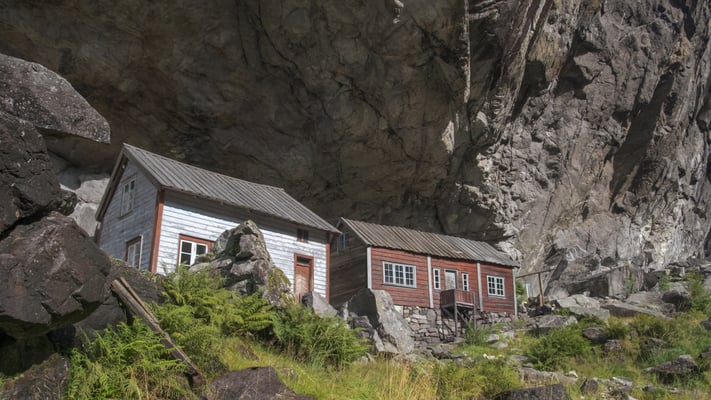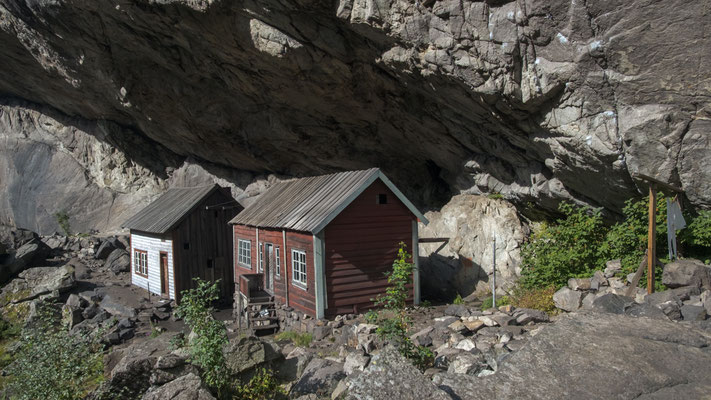 Unten beim Jössingfjord machen wir unseren ersten Halt bei den Helleren. Dabei handelt es sich um alte Häuser die zu einem grösseren Gehöft gehörten. Dieses wurde zum ersten Mal um 1745 erwähnt. Die Häuser werden von einem grossen überhängenden Fels gut geschützt. Die jetzt noch stehenden Häuser stammen vermutlich aus dem frühen 19. Jahrhundert.