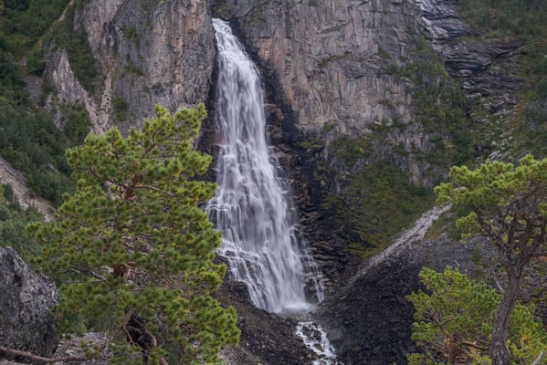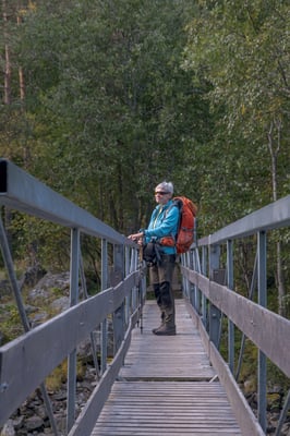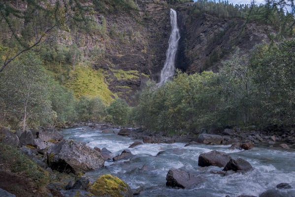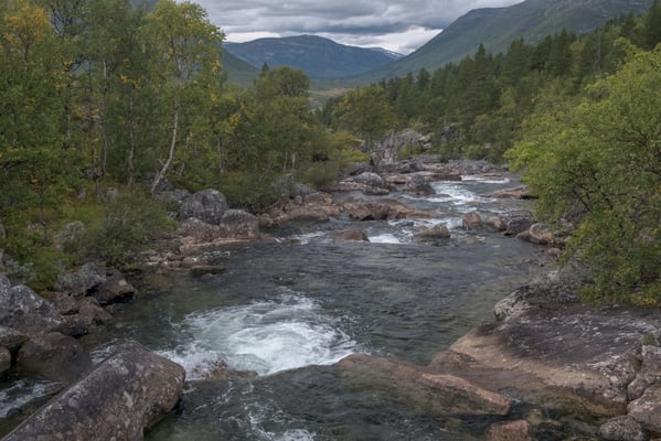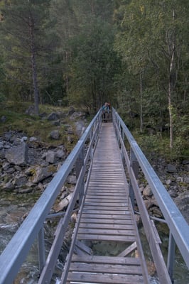 Wir setzen unseren Plan um und starten bereits um 8 Uhr zu unserer Åmotan Rundtour. Wir sind ca. 5 Std. unterwegs, Die Tour ist 7 ½ km lang und hat etwa 450Hm. Nach kurzer Zeit sind wir beim schönsten Wasserfall, dem Svøufallet. Danach führt der Pfad dem Fluss entlang und überquert diesen später. Vorsicht ist auf den Brücken geboten. Schwergewichte sind gut beraten, ihre Füsse immer am äusseren Rand aufzusetzen. Mehrere Latten des Brückenbodens sind bereits gebrochen.