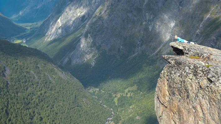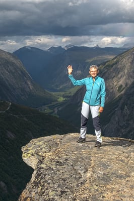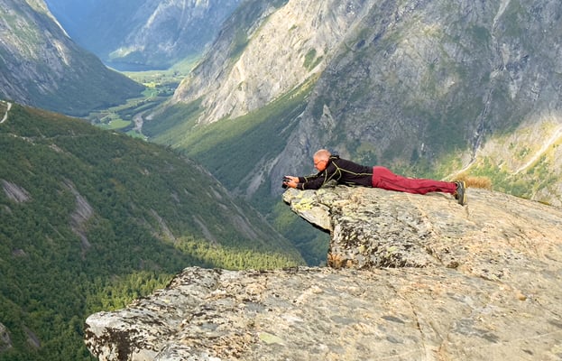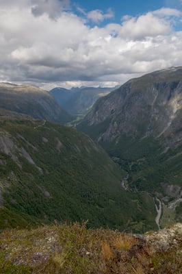 Wir halten immer wieder an um Fotos zu machen. Jetzt etwas später am Tag, kommt doch so etwas wie Verkehr auf. Ich muss öfter zurückfahren, um Gegenverkehr vorbei zu lassen. Etwas 40 Min. vor Eikestalen hat es den Aussichtspunkt Aurstaupet. Er erinnert ein wenig an die Trolltunga. Auch hier machen wir natürlich ein paar Bilder.