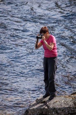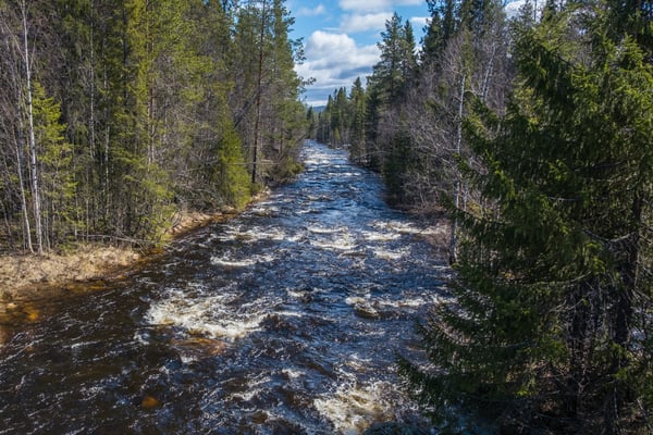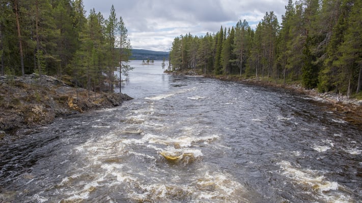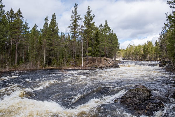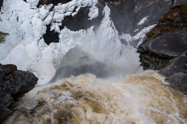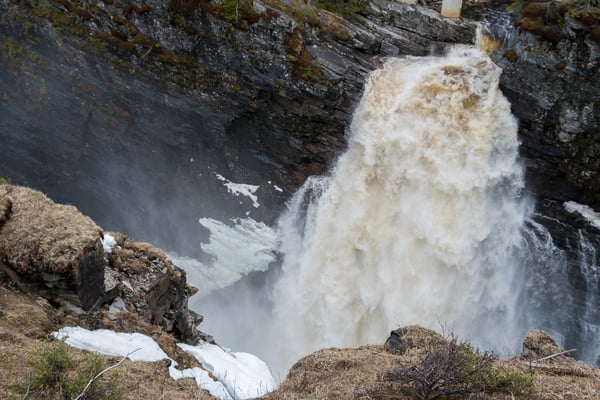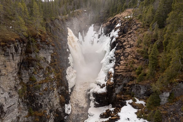 Der Platz ist nicht sehr gross, liegt aber schön. Wer das Tosen und Gedröhne des naheliegenden Wasserfalls nicht verträgt sollte nicht hierherkommen. Wir stehen gleich neben dem mächtigen Indalsälven der ca. 100m weiter flussabwärts über einen Fall hinab stürzt. Hier hat es immer noch dicke Schneeresten mitten im Fluss. Wir machen nach der langen Fahrt eine Kaffeepause. Danach unternehmen wir eine Fotosession beim eindrücklichen Wasserfall. Auch die Drohne kommt hier wieder einmal zum Einsatz. Gerade bei den Wasserfällen ermöglicht sie Fotos aus Perspektiven die sonst nicht möglich sind.