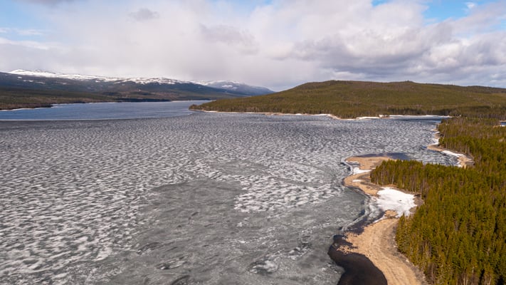 Wir gehen den Tag gemächlich an. Nach einem gemütlichen Z’morge lasse ich die Drohne für einen kurzen Flug hoch. Schliesslich will der teilweise noch gefrorene See und unser Übernachtungsplatz noch dokumentiert werden. Am späteren Vormittag machen wir uns dann auf den Weg. Diesmal geht das Suchen nach einsamen Nebenstrassen schief. Ca. 12km nach der Abzweigung kehren wir um und kehren reumütig auf die 342 zurück. Die Alternative wandelt sich nach einer kleinen Siedlung in eine üble mit Schlaglöchern überzogene Schotterpiste.