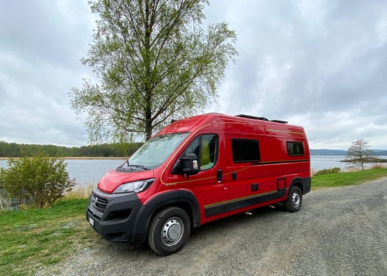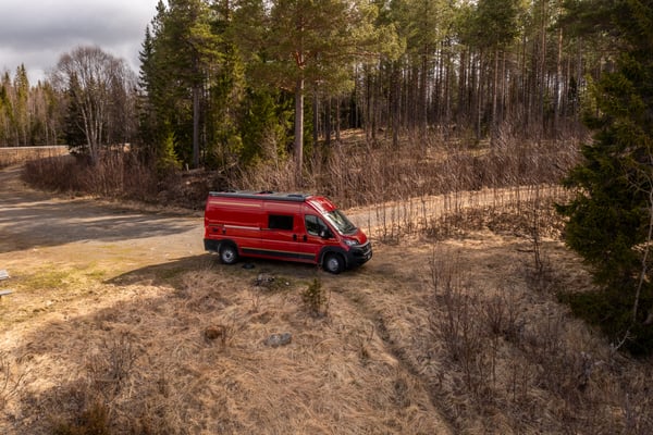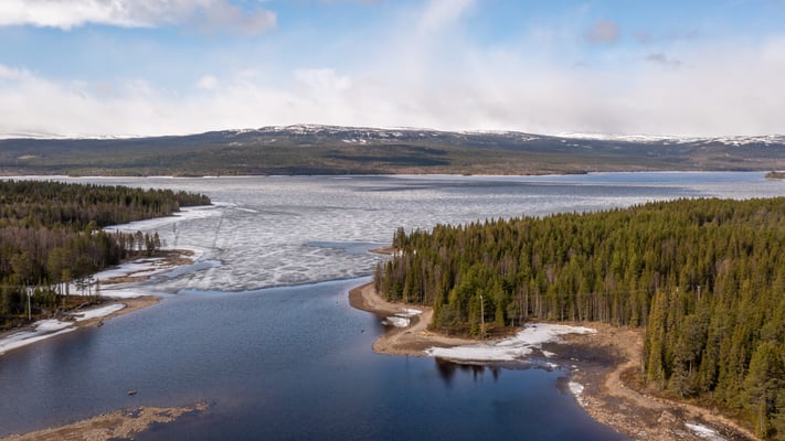 Später fahren wir über die Grenze nach Norwegen. Hier wähnen wir uns noch im Winter. Es liegt noch viel Schnee neben der Strasse, die Seen sind immer noch mit Eis bedeckt. Kurz vor Gäddede queren wir die Grenze wieder. Wir wollen noch zum Hällingsafallet. Bei unserem Besuch im letzten September hatte er nicht soviel Wasser. Die Strasse ist nun besser. Es hat bedeutend weniger Schlaglöcher. Dafür liegt zu unserer Überraschung kurz vor Ende der 21km langen Strecke noch Schnee auf der Strasse. Zum Glück hat es einige Spuren drin, andernfalls hätte ich die Ketten montieren müssen. Mit der Traktionshilfe wühlen wir uns durch. Aufpassen muss ich, dass ich mit der Hinterachse nicht seitlich wegrutsche und in dem tiefen Entwässerungsgraben lande. Die Strassen sind hier wie auf Dämmen. Es geht alles gut. Beim Wasserfall sind wir alleine. Wir wollten ursprünglich hier über die Nacht bleiben. Der Parkplatz war aber schneebedeckt. Für die Nacht ist Regen angesagt, was vermutlich eine unangenehme Sauce zur Folge haben wird. So machen wir ein paar Fotos, lassen die Drohne steigen und packen bald wieder zusammen. Die Rückfahrt schaffen wir auch ohne Probleme. Nun müssen wir uns nur noch eine Alternative für die Nacht suchen. Etwa 15 Min. nach Gäddede finden wir einen schönen Rastplatz an einem See wo wir unsere rote Zora für die Nacht hinstellen.