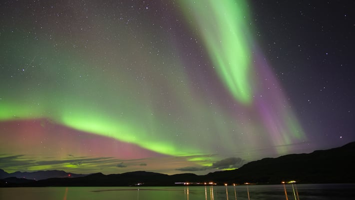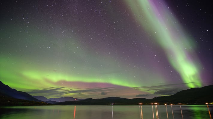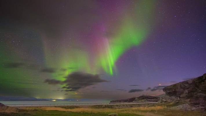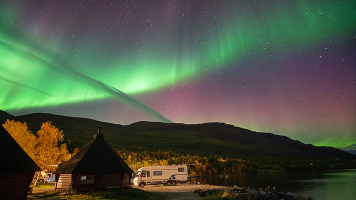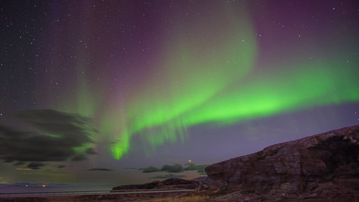 Heute Nacht wache ich auf. Die Blase drückt. Und wenn ich nun schon auf bin, öffne ich gleich noch die Schiebetür und tatsächlich, es sind Nordlichter zu sehen. Nun bricht Hektik aus, warme Kleidung wird direkt über das Pyjama angezogen. Stativ und Kamera rausholen und loslegen. Wir haben sehr viel Glück. Die ersten Aufnahmen sind die Besten. Nach einer halben Stunde ist die Show vorbei. Wir hatten zwar den Wecker gestellt aber eine halbe Stunde zu spät. Wäre ich nicht zufällig aufgewacht, hätten wir nichts von den Nordlichtern mitbekommen.