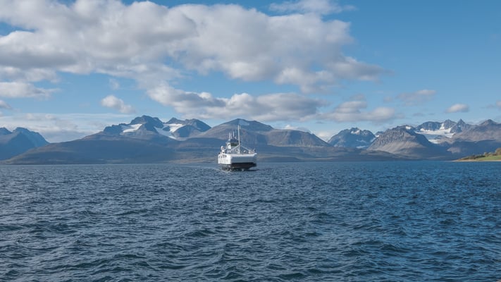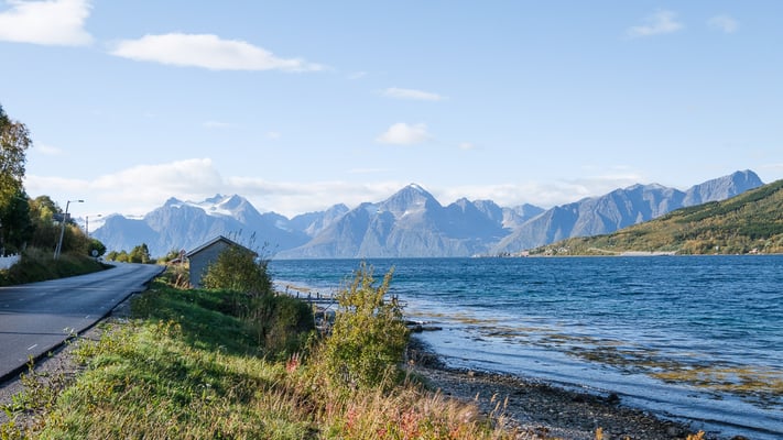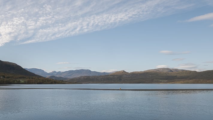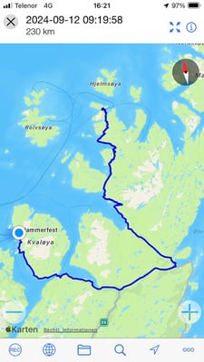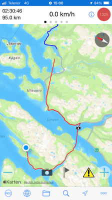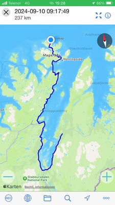 Die heutige Fahrt dauert nur zwei Stunden. Dafür beinhaltet sie die erste kurze Fährüberfahrt von Olderdalen nach Lyngseidet. Sie endet am grossen PP, wo die Wanderung zum Blausee beginnt. Wir haben sie vor zwei Jahren im Mai nier schon einmal gemacht. Damals war der See von einer dicken Eisschicht bedeckt. Vom Blausee war nichts zu sehen. Darum sind wir nun nochmals hier.