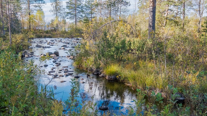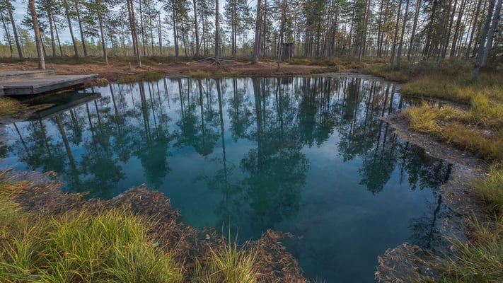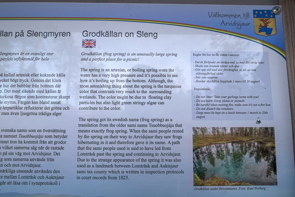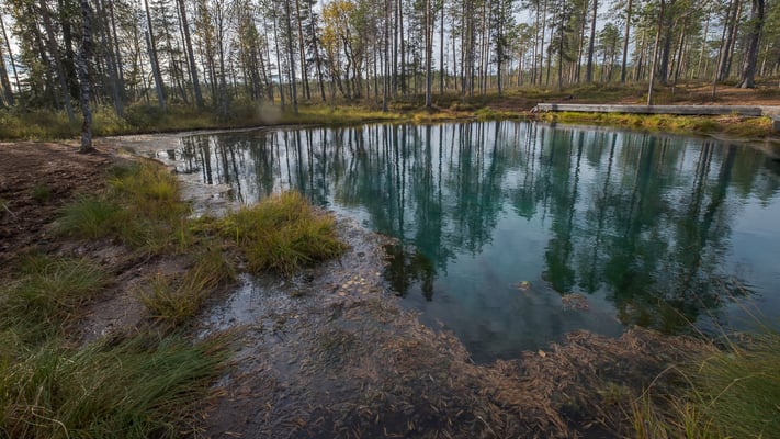 Unser erstes Ziel steht im Untertitel. Es ist eine Quelle im nirgendwo, die von den Sami früher als Landmarke benutzt wurde. Die Quelle ist atypische für das Gebiet. Das Wasser ist türkis gefärbt und das Wasser kommt unter hohem Druck in drei Meter Tiefe in Blasen aus dem Boden. Das ist durch das glasklare Wasser gut zu sehen.