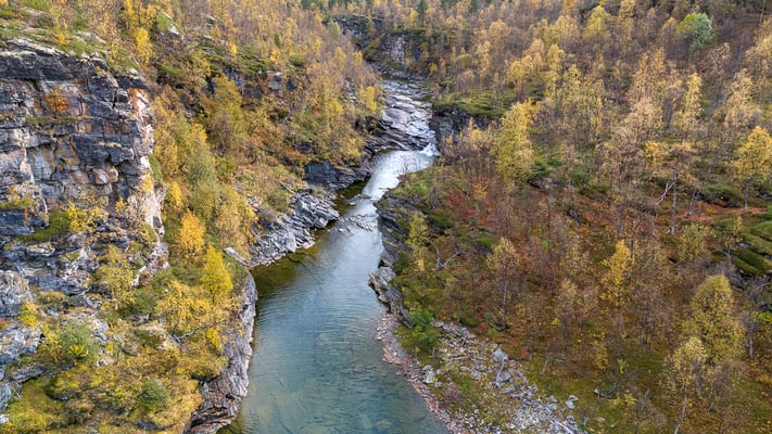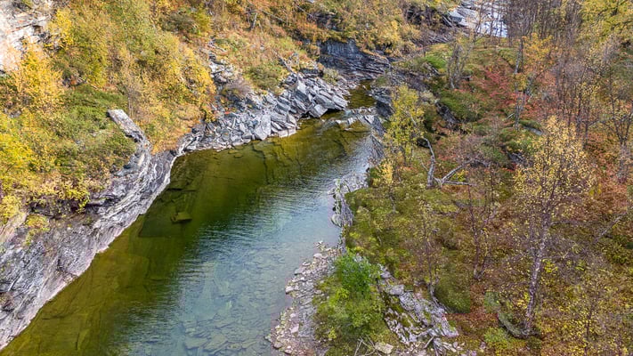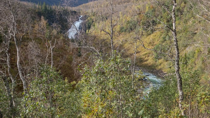 Die Fahrt dorthin umfasst nur 150Km. Unterwegs machen wir wieder mal einen Einkaufsstopp. Leider können wir unsere Weinvorräte nicht ergänzen. Viele der Vinmonopolets in den kleiner Orten haben nur Do. - Sa. offen. So haben wir nun Pech gehabt. Die Fahrt verläuft wieder gemächlich. Es hat mit Ausnahme des kurzen Stücks auf der E6 kaum Verkehr. Einen kurzen Stop haben wir beim Wasserfall Rovijoen Putous eingelegt.
