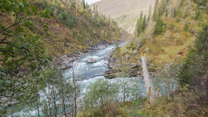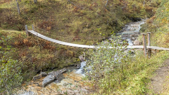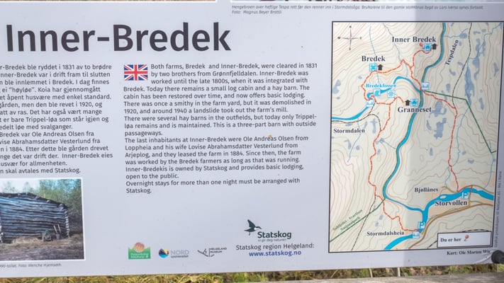 Eine Beschreibung der Wanderung findet man bei Nordlandblog. Ich verzichte deshalb auf eine genaue Beschreibung der Tour. Man kann sie gut in einem halben Tag machen und es lohnt sich. Wir kommen an drei alten, nicht mehr bewohnten, Bauernhöfen vorbei. Zuerst bei Inner Bredek, dann Bredek und zuletzt Granneset. Das Leben hier oben muss hart gewesen sein. Ähnlich wie auch bei uns in der Schweiz in den Alpen um diese Zeit. Die Wanderung führt durch lichten Wald mit einigen Mooren, über 4 Hängebrücken und auch ein mächtiger Wasserfall, der Bredekfossen, gehört dazu.