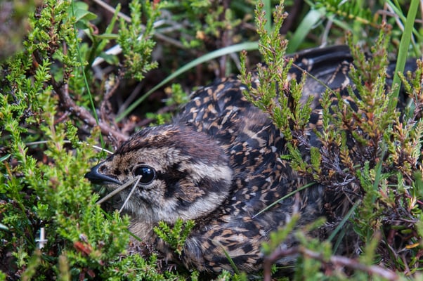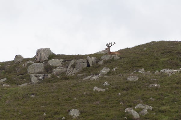 Der Weg geht vom PP hinunter zum Visitor Centre. Dabei handelt es um eine grosse Holzbaracke mit vielen Informationen über das Gebiet und seine Tierwelt. Ein Besuch vor oder nach der Tour lohnt sich. Kurz darauf biegen wir rechts ab, gehen über die breite Ebene und erreichen auf der anderen Seite Allt-na-giubhsaich. Das ist ein kleines Wäldchen mit Gebäuden die zum Balmoral Estate gehören. Wir durchqueren den Wald und folgen einem breitem Pfad. Nach ca. 2 ½ Km erreichen wir eine Weggabelung mit einem grossen Steinhaufen. Hier nehmen wir die linke Seite. Wir beobachten viele Red Grouses, die nahe am Wegrand im Heidekraut sitzen und mit grossem Lärm auffliegen, wenn wir vorbei kommen. Das Red Grouse nennt sich auf deutsch Moorschneehuhn und gehört zur Familie der Rauhfusshühner.