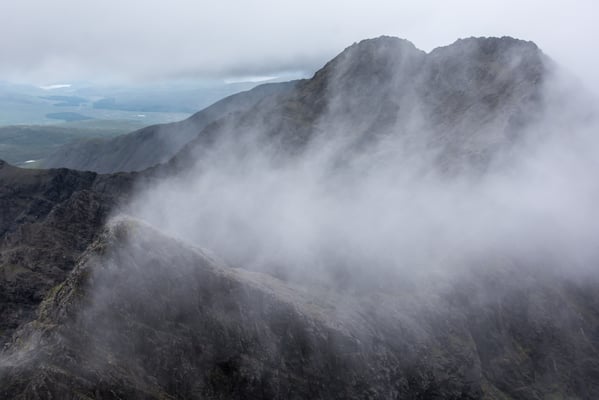 Auf dem Sattel unterhalten wir uns längere Zeit mit einem anderen Berggänger. Wir nehmen solche Gelegenheiten immer wahr. Oft ergeben sich daraus interessante oder auch nur unterhaltsame Gespräche. Auf dem Gipfel sind die Wolken ziemlich dicht. Aber wir sind geduldig. Immer wenn die Wolken kurz aufreissen tun sich neue Blicke auf und unsere Fotoapparate bekommen Arbeit. Drüben am Sgurr Thormaid sind Kletterer am Werk.
