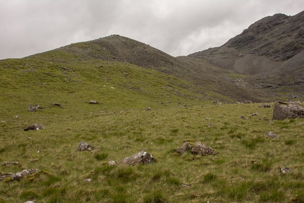 Wir sind bald alleine. Dieser Gipfel ist nicht so begehrt wie seine berühmten Nachbarn. In der Regel wird er so nebenbei bei grösseren Unternehmungen überschritten. Wir folgen dem Bach Allt a’ Choire Ghreadaidh. Nach ca. 1,6 Km biegt ein schwacher Pfad rechts ab. Ihm folgen wir eine Weile, verlassen ihn dann später und steigen auf einem breiten Rücken direkt hinauf auf den An Diallaid. Mehr oder weniger flach gehen wir hinüber zu einem namenlosen Sattel bevor es dann zum Gipfelaufbau des Sgurr na Banachdich geht.