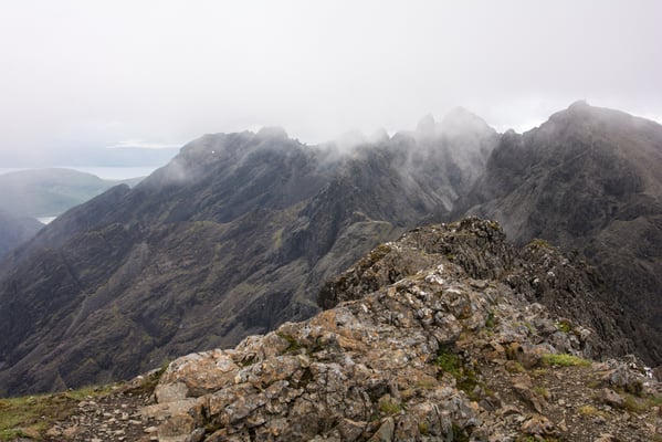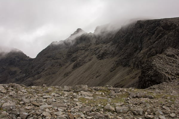 Unser Ziel ist der Sgurr na Banachdich. Mit einer Höhe von 965m gehört er zu den Munros. Er ist einfach zu besteigen solange die Sicht gut ist. Ist dies nicht der Fall wird es sofort heikel. Wir starten an der Strasse im Glen Brittle fast auf Meereshöhe. Rechts (südlich) der Brücke beginnt ein gut erkennbarer Pfad der über teils sumpfige Hänge hoch führt. Wie meistens hier in Schottland gibt es keine Wegmarkierungen.