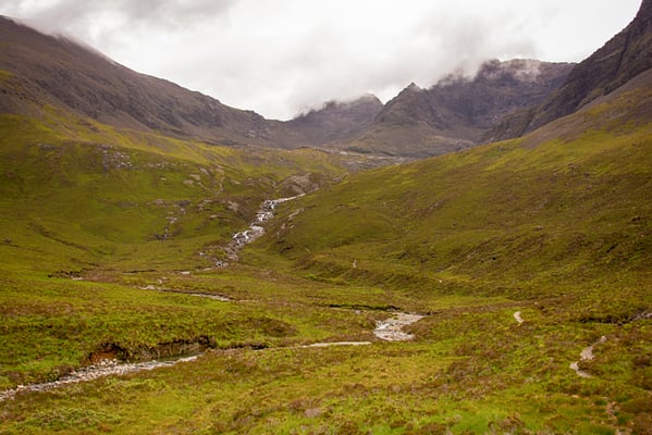 Ausgangspunkt: Auf der A87 bis Sligachan, dort abbiegen auf die A863, dann bei der Abzweigung auf die B8009 (Carbost, Talisker) bis nach Merkadale, dort die nicht nummerierte Strasse in das Glen Brittle nehmen. Parkieren an der Strasse bei der Brücke an Punkt NG 40959 22505