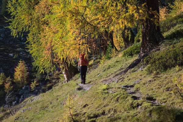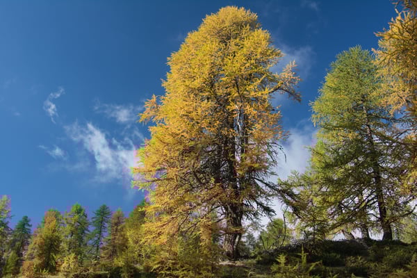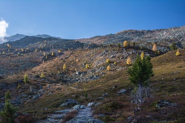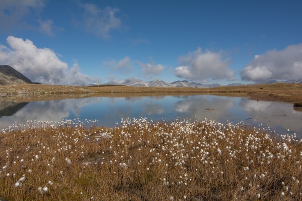 Bei Era da la Bescha verlassen wir den Wald. Das nächste Etappenziel ist nun der Lai da Chazfora. Einzelne kleine, von Wind und Wetter gebeutelte, bereits golden gefärbte Lärchen prägen nun das Bild. Der Lai da Chazfora liegt wunderbar auf einer Terrasse mit einer super Aussicht. Dichtes Wollgras säumt am Südende das Ufer. Wir verweilen über eine ½ Std. an diesem wunderbaren Ort.