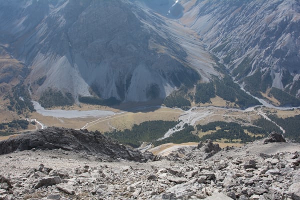 Auf dem Gipfel des Piz Turettas stehen wir ca. 1 Std. später. Die markierte Route führt östlich am Piz Chazfora vorbei und durch unübersichtliches Gelände zum Fuss des Aufstieges zum Ostgipfel. Dank der verwaschenen Markierungen ist die Orientierung aber problemlos. Der Schlussanstieg durch das Geröll ist steil aber unschwierig. Vom Ostgipfel gehen wir dann einfach hinüber zum Hauptgipfel.