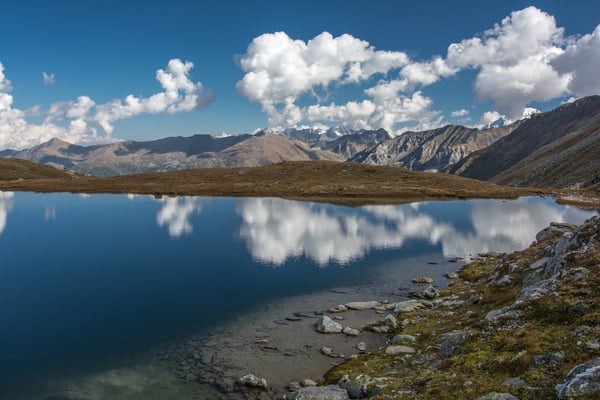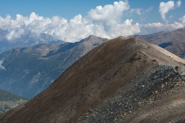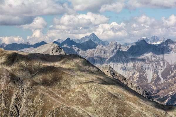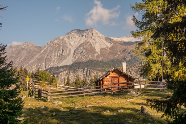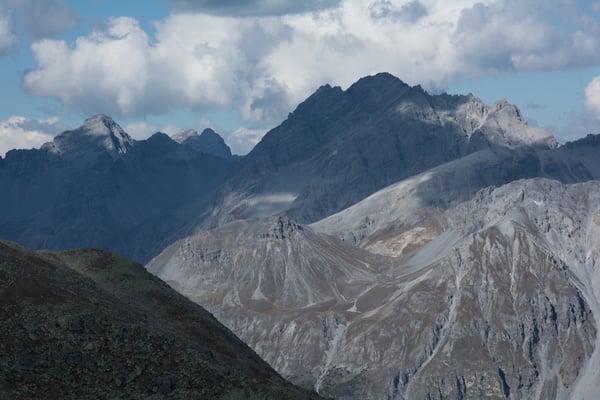 Die Aussicht ist grossartig. Der Ortler und seine Nachbarn verstecken sich zwar meistens in den Wolken, aber es bleibt noch genug für das Gipfelrätsel übrig. Öfter sind wir uns nicht einig, das Peak Finder App übernimmt dann jeweils die Schiedsrichterrolle ;-). Nach 1 ½ Std. verlassen wir widerstrebend den Gipfel. Es wäre ein traumhafter Biwakplatz. Wir steigen auf dem gleichen Weg ab, machen aber noch einen kurzen Abstecher zum Piz Chazfora. Beim Lai da Chazfora biegen wir rechts ab. Abwechslungsreich wandern wir über den Rücken Muntet bis zum Punkt 2426. Zu unserer Überraschung treffen wir auf einen Mountainbiker der sein Bike auf dem Rücken über diesen Grat trägt. Alle Achtung vor dieser Leistung. Wir steigen weiter hinunter bis zur super schön gelegenen Jagdhütte bei Salinas. Dort machen wir nochmals eine längere Pause. Wir wollen diesen sonnigen Herbsttage bis zum Schluss geniessen. Von der Alp Sadra an wandern wir dann auf der Fahrstrasse. Wir machen noch einen kurzen Abstecher zum Lai Zoppa. Leider ist er fast zur Hälfte ausgetrocknet. Beim Punkt 1866 wechseln wir wieder auf die Aufstiegsroute und kurze Zeit später sind wir wieder am Ausgangspunkt.