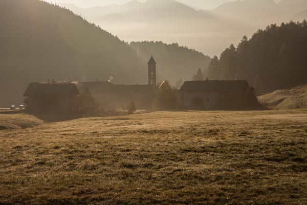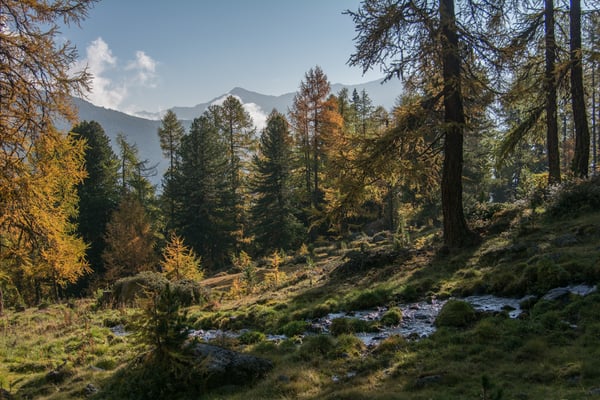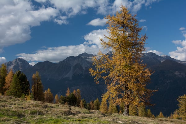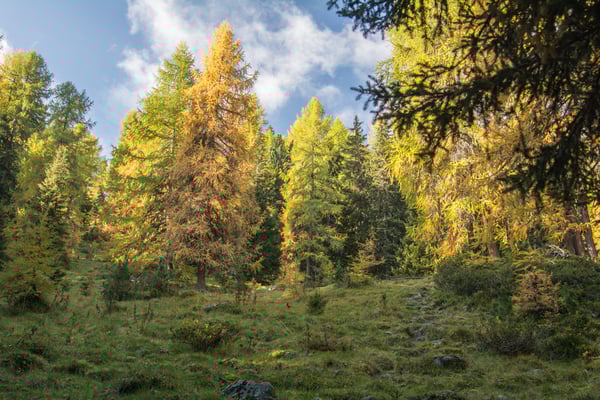 Leichter Bodennebel liegt über der Wiese Chlüs zwischen Tschierv und Tschierv Platz. Eine wunderbare herbstliche Stimmung kommt auf. Wir folgen dem Pfad, der sanft durch den Wald ansteigt. Beim Punkt 1866 mündet er in die Fahrstrasse die von Fuldera herkommend weiter hinauf zur Alp Sadra führt. Auf ihr gehen wir aber nur kurz, nach ca. 300m verlassen wir sie wieder und wandern weiter via Punkt 1920 durch das Gebiet Funtauna Grossa hinauf nach Era da la Bescha. Der Wald beginnt sich bereits gelb zu färben, der blaue Himmel mit den weissen Wolken bildet einen schönen Kontrast. Es ist wie im Märchen.