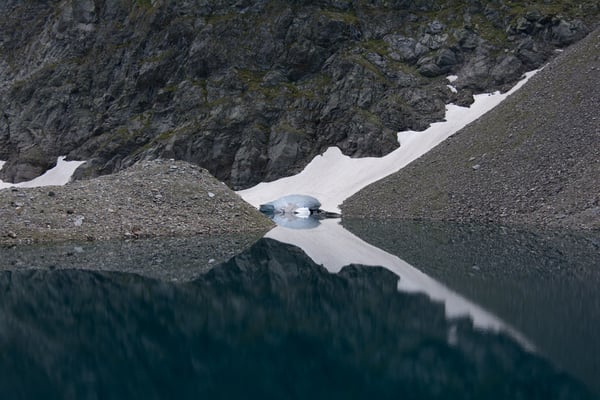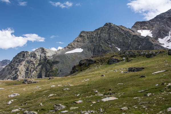 Der Abstieg hinunter zu den Sirwolteseen verläuft über eine Geröllhalde. Der Kessel bei den Sirwolteseen ist ein Zielgebiet der Artillerie. Entsprechend liegen hier viele Reste von Granaten herum. Beim Punkt 2412 nehmen wir nicht den direkten Weg hinunter. Wir gehen noch ein wenig weiter bis zum Sirwolte Weiher. Hier hat es auf der Wiese rote Säcke. Sie markieren die Depots wo die gesammelten Munitionsreste angehäuft und dann vermutlich später abgeholt werden.