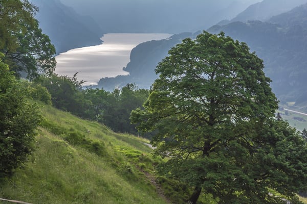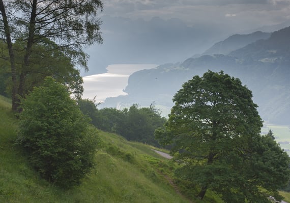 Um 8 Uhr fahren wir mit der Seilbahn von Niederurnen hinauf nach Morgenholz. Das Wetter weiss noch nicht so recht was es will. Es regnet leicht als wir steil hinauf steigen zum Hirzli. Die Luft ist feucht und warm. Der leichte Regen hört bald auf aber nun sind wir einfach wegen des Schwitzens nass. Die Route führt uns via Schwinfärch und Forsthaus hinauf zum Hirzli.
