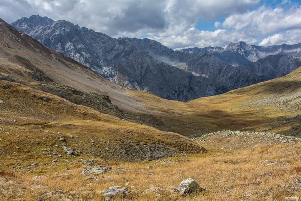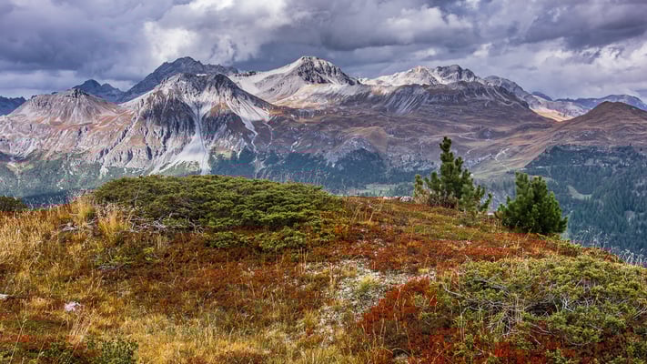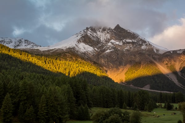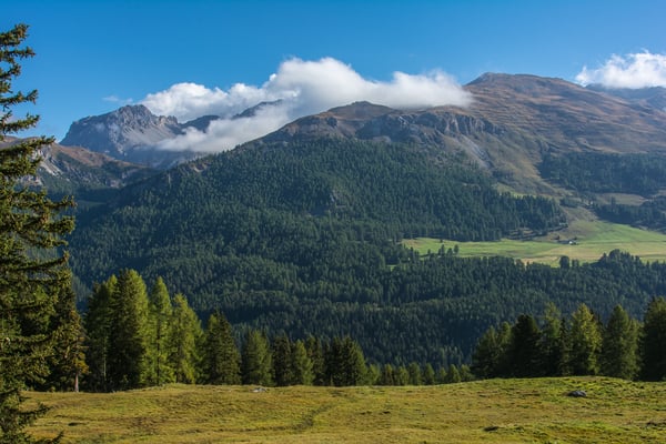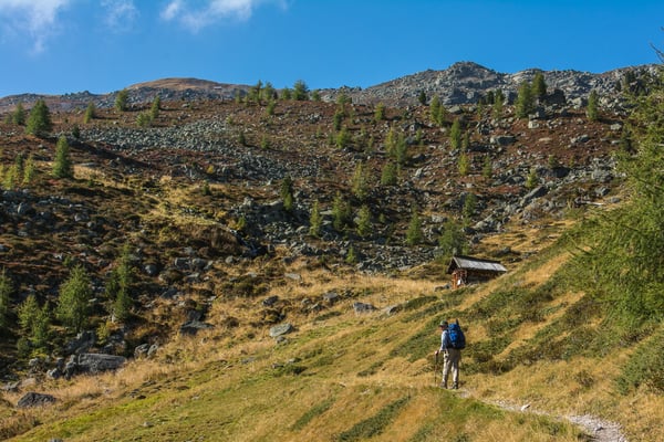 Der Aufstieg beginnt bei Tschierv Platz und ist durchgängig markiert und nirgends schwierig. Nach ein paar Minuten erreichen wir eine kleine Wiese. Pfadspuren führen hier gerade aus. Ihnen darf man nicht folgen. Wenn man genau hinschaut erkennt man die r/w Markierungen am Rechten Rand der Lichtung. Angenehm führt der Weg hinauf durch den Wald Plaun Chamona zum Punkt 1866. Hier treffen wir auf die Alpstrasse die zur Alp Sadra führt. Nach ca. 250m verlassen wir sie wieder, scharf rechts abbiegend und kommen bald zur wunderschön gelegenen Hütte bei Funtauna Grossa. Der Name sagt es schon, die Stelle ist ziemlich nass und moorig. Wir steigen weiter hinauf zur Hütte bei Era da la Bescha. Der Wald wird immer lichter und erlaubt schöne Ausblicke auf die andere Talseite. Leider ist die goldene Zeit der Lerchen schon fast vorbei.