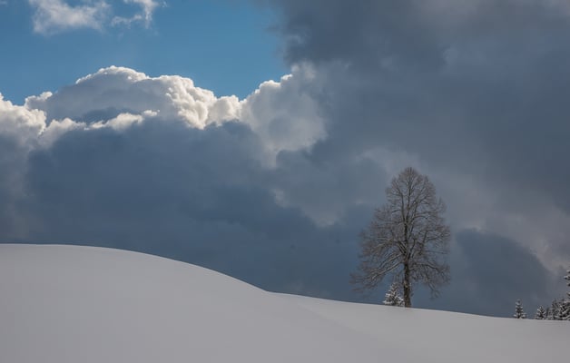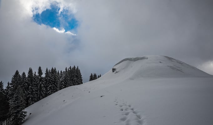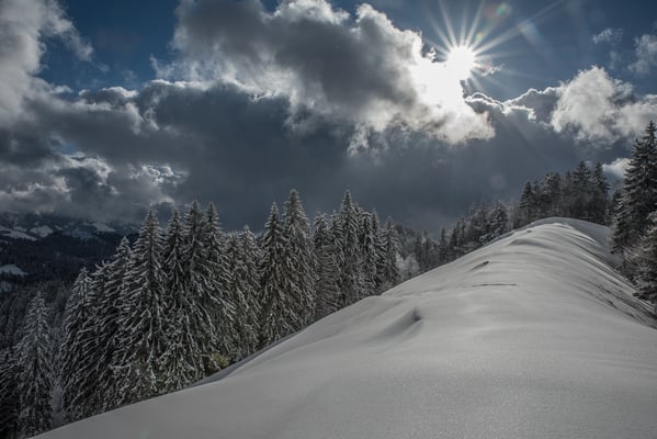 Der Abstieg führt uns zuerst gegen Westen und dann südlich zum Punkt 1278. Bis hierher hat es eine Spur. Ab dem Punkt 1278 haben wir das Gelände wieder für uns allein. Beim Punkt 1308 hat der kräftige Wind eine fotogene Wechte gebildet und viel Schnee auf der Ostseite abgelagert. Wir passieren das idyllische Grüebli und steigen hinunter zum Punkt 1269. Die Sonne reisst nun immer wieder Lücken in die Schneewolken und schafft so wunderbare Stimmungen. Dort weist ein unauffälliger Wegweiser die Richtung hinunter zur Mettlenalp. Bei Mittelmettlen erreichen wir den Talboden, von dort sind es nur noch 5 Min. zurück zum Ausgangspunkt. Wir kehren nochmals in der Beiz ein. Beim Morgenkaffee ist mir ein Schild aufgefallen, dass Meringue mit frischer Nidle anpreist. Wir beschliessen die Tour mit dieser süssen Köstlichkeit. Sie ist hervorragend. Auch die Portionen sind gut bemessen. Ich war jedenfalls froh, nur die mittlere Portionengrösse bestellt zu haben.