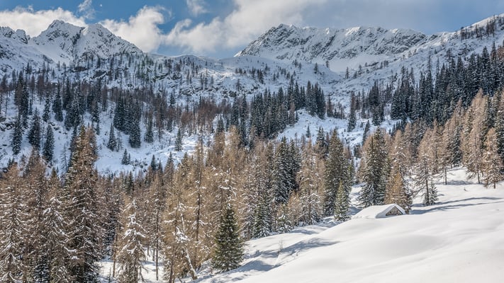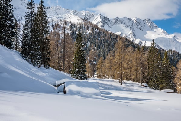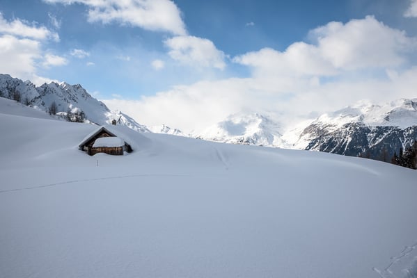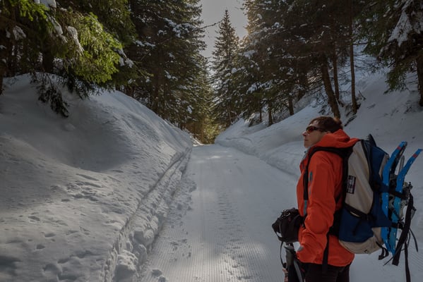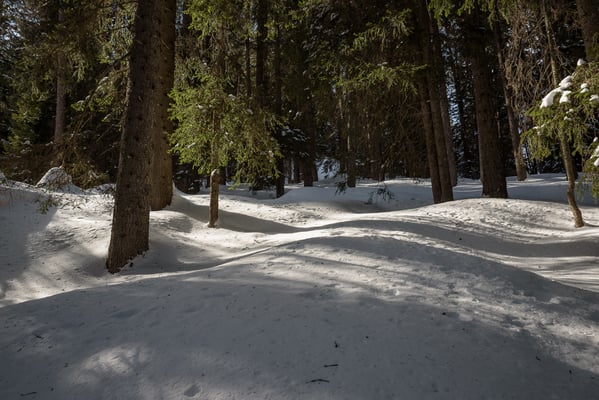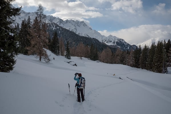 Beim Reservoir beginnt dann der anstrengende Teil der Tour. Wir sind offensichtlich die Ersten die nach den Schneefällen hinauf zur Hütte gehen. Auf der orografisch rechten Seite der Calcascia suchen wir uns einen Weg durch den Wald. Das auf der Karte eingezeichnete Weglein ist unter einer dicken pulverigen Schneedecke gut versteckt. So suchen wir uns eine mehr oder weniger optimale Route durch den schönen Wald.
