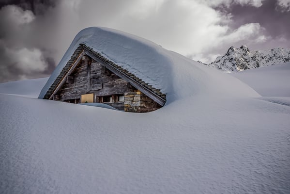 Beim Punkt 1613 queren wir hinüber nach Pian Taiöi. Die breite Alpstrasse ist unter dem vielen Schnee nur schwach zu erkennen. Nach Pian Taiöi geht es nicht dem markierten Weg entlang. Die Winterroute führt über den Bach und dann steil durch den Wald in südöstlicher Richtung hinauf. Auch hier muss man sich die optimale Route selber suchen. Das gelingt dieses Mal nicht immer auf Anhieb und so gibt es die eine und andere kraftraubende Einlage. Auf der Höhe des Punkts 1819 sehen wir ab und zu wieder r/w Markierungen. Schlussendlich erreichen wir nach fast 4 Std. sehr anstrengender Spurarbeit die Hütte.